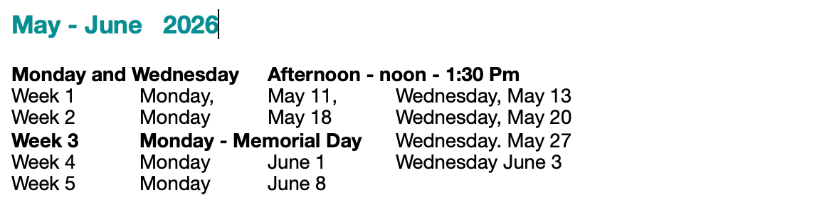 Please note - no classes - on Memorial Day